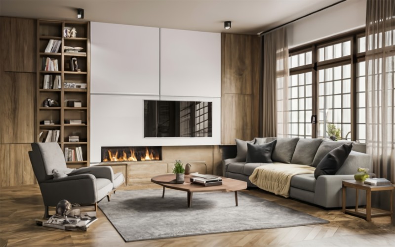 • Декор: текстильные подушки, шкуры, керамические вазы.